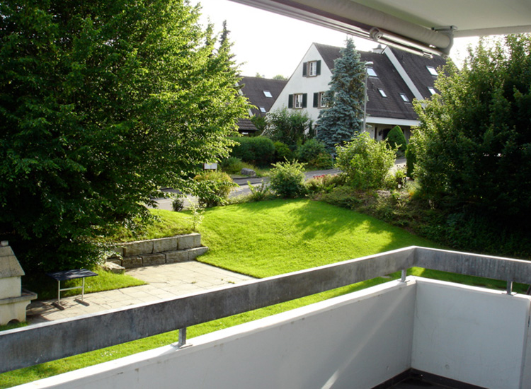Blick vom Balkon in den Gemeinschaftsgarten mit Grillstelle und Spielplatz.